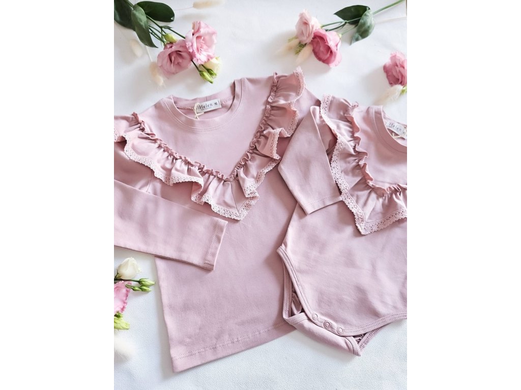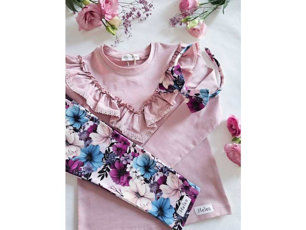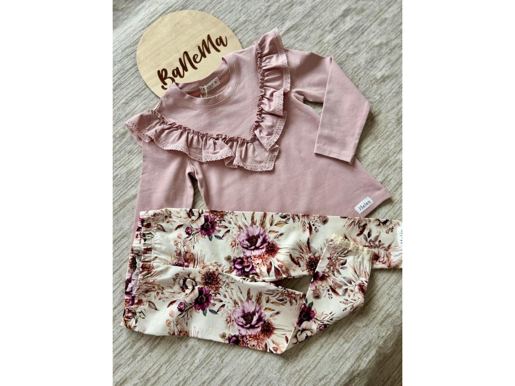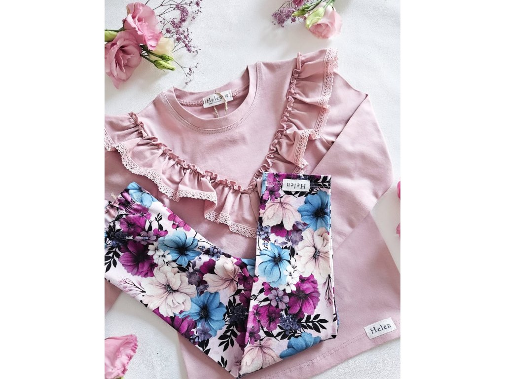 Halenka je ve světle růžové barvě. Dominantní kousek na této halence je nádherný volán kolem výstřihu, zdobený jemnou krajkou, což dodává romantický nádech. Nádherná kombinace s legínami ze stejné kolekce s živými květy.