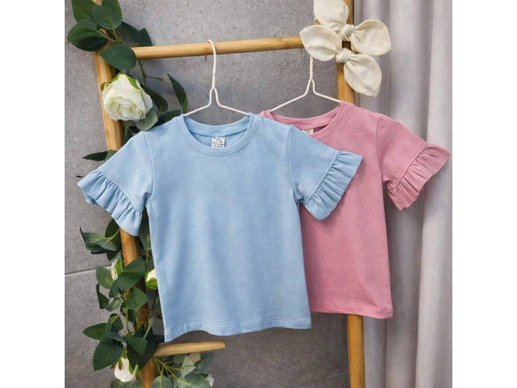 Dodejte šatníku vaši malé parádnice šmrnc s tímto stylovým tričkem, který v sobě spojuje maximální pohodlí a něžný dívčí design. Toto nádherné blankytně modré tričko s krátkým rukávem, zdobené jemnými volánky na rukávech, je ideálním kouskem malé i velké parádnice.