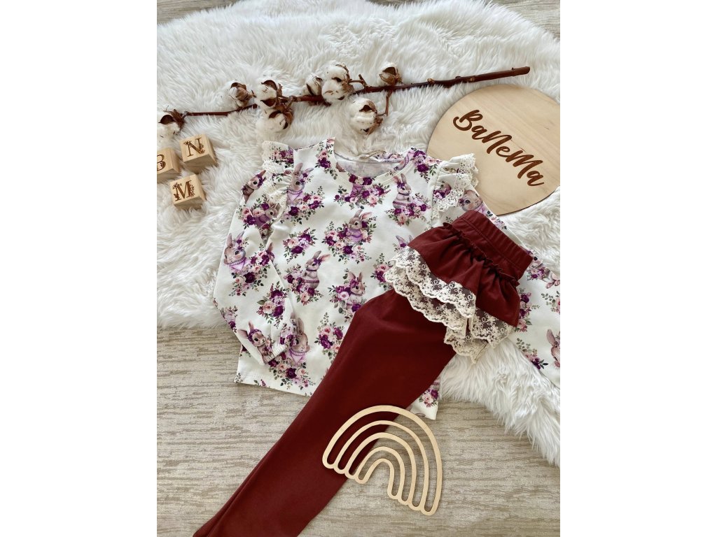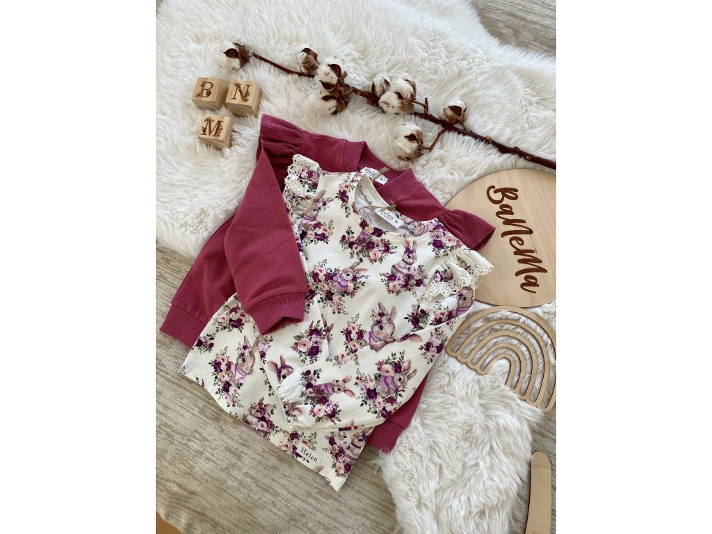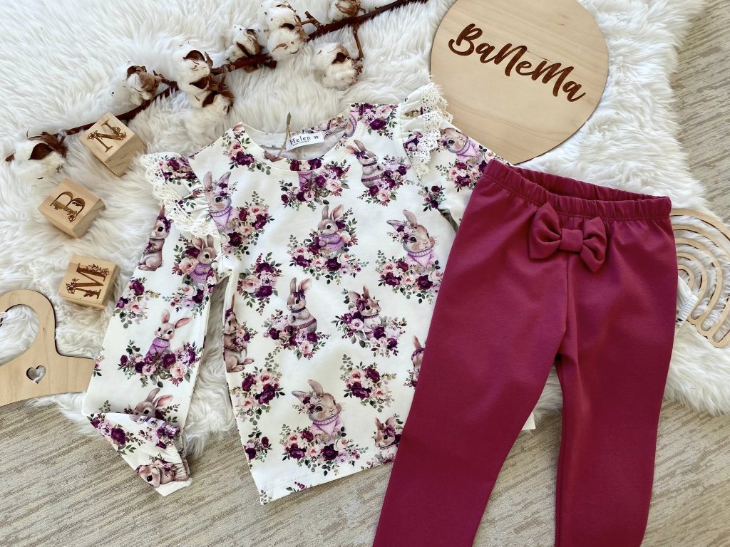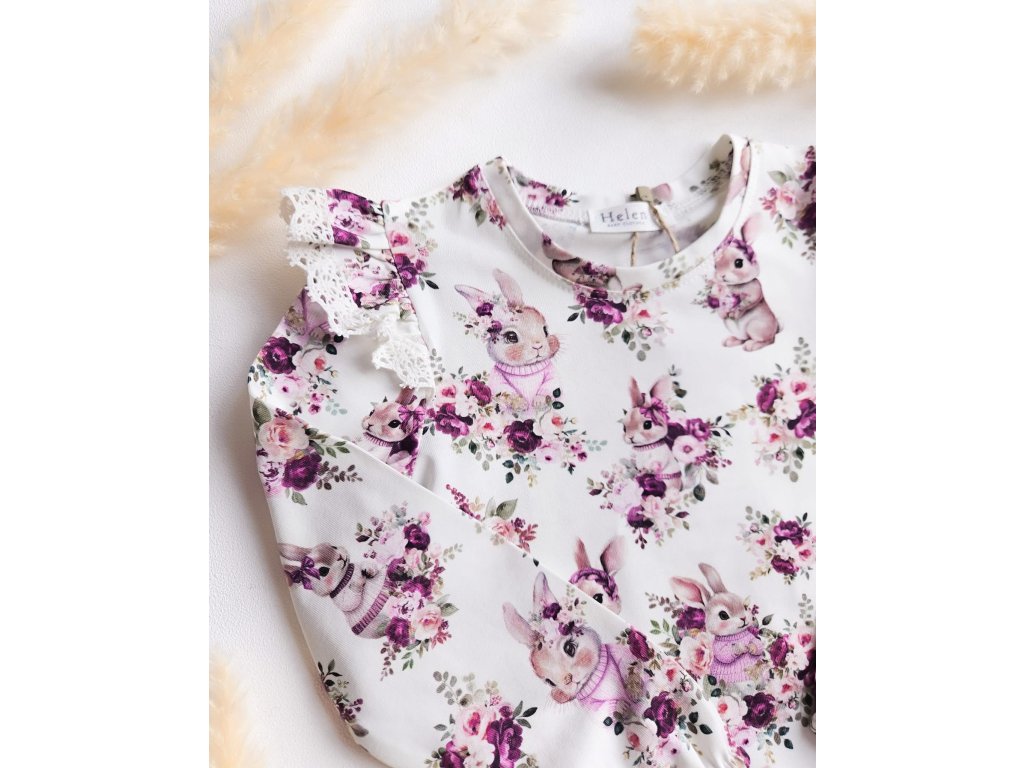 Dlouho očekávaná novinka halenek a body, jsou konečně tu. Na bílém podkladu, jsou slečny králičice oblečeny do fialových pletených svetříků, zahaleny do bohatých pugétů květin v odstínech fialové, růžové a vínové.