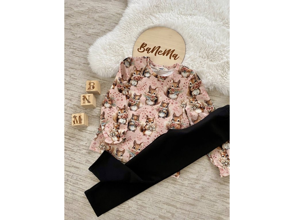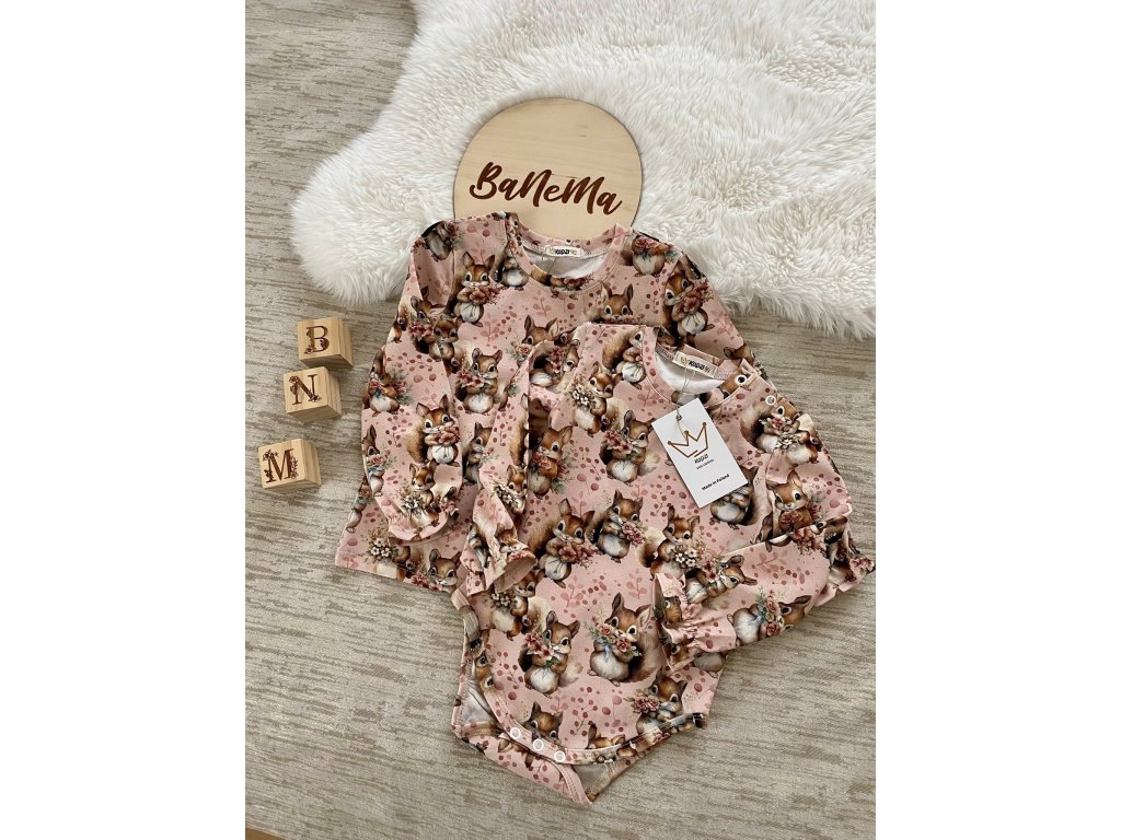 Světle růžový podklad s drobnými červenými a růžovými lístky a bobulemi. Potisk veverek je jemný, kreslený vzhled, který připomíná akvarelovou malbu, a působí něžně a hravě.