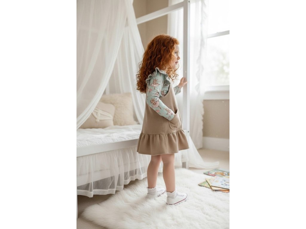 Stylový kousek pro malé parádnice, to jsou tyto béžové šaty s laclem a volánkem. Jsou na každodenní nošení, do školky i na rodinné oslavy. Nádherné kombinace s tričkem s dlouhým rukávem s panenkami, nebo králíčky a budete mít dokonalý outfit který vás bude bavit. Délka volných velikostí šatů