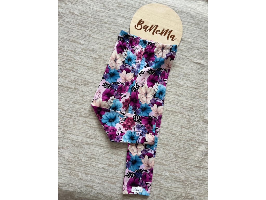 Pestrobarevné květinové legíny na světle růžovém podkladu. Velké květy jsou v odstínech fialové, modré, tyrkysové a světlonce růžové. Nádherně se doplňují s halenkou ze stejné kolekce ve světle růžovém a modrém odstínu.