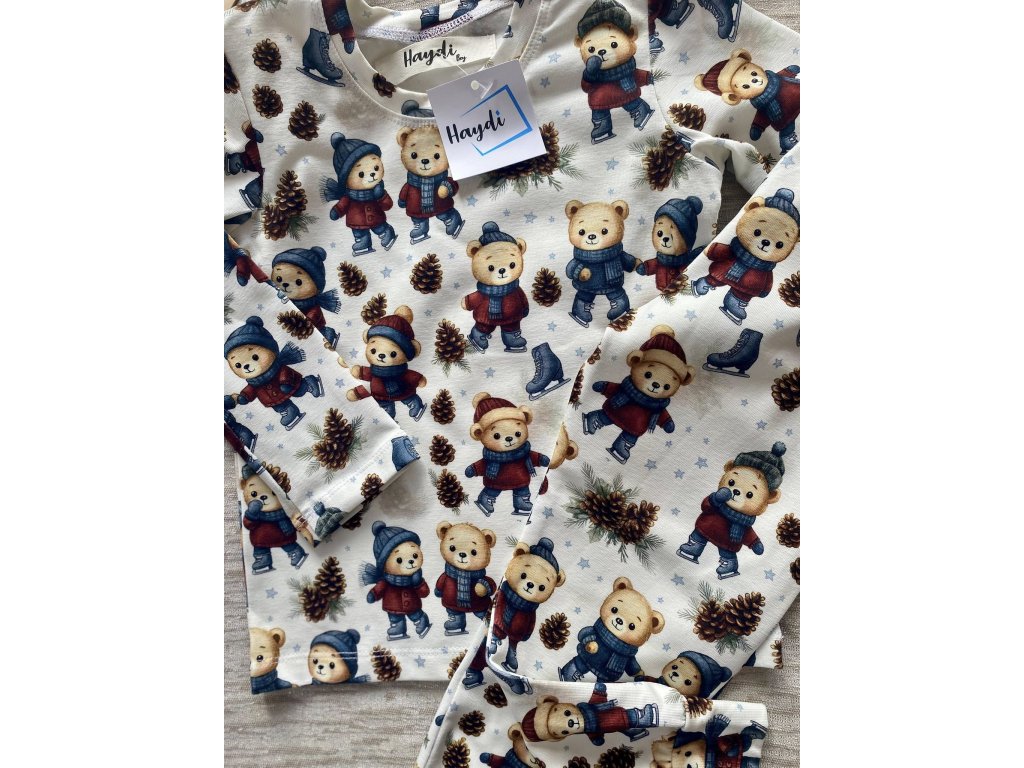 Krásné Vánoční pyžámko, podklad je bílý s potiskem bruslících medvědů, kteří jsou krásně oblečení do zimních kabátků a čepic. Celý potisk je ještě poset šiškami a minimalistickými hvězdičkami.