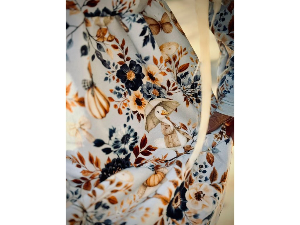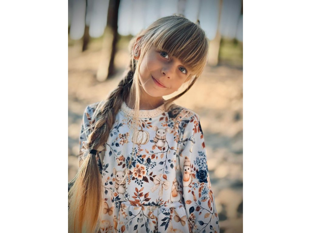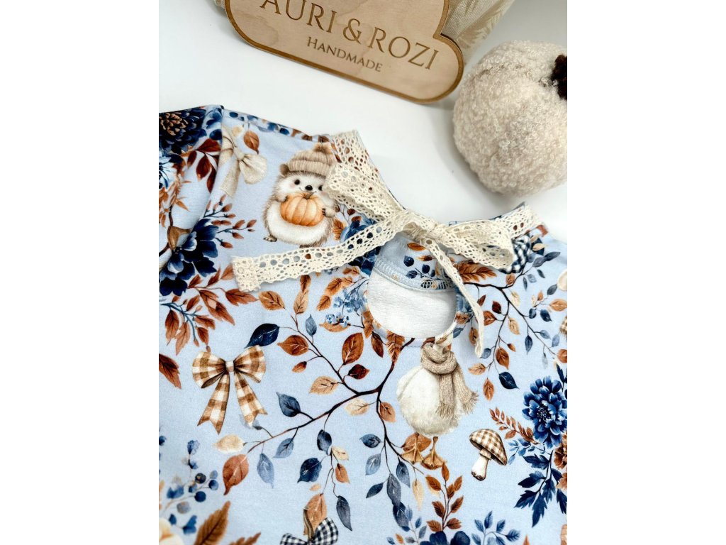 Wow, to jsou přesně tyto šaty. Splňují vše, jemnost, krásu, eleganci, zamilujete se do podzimních tónů. Barva je azurová se zvířátky. Šaty mají romantickou krajku, kolem krku až na záda, kde ji uvážete na mašličku. Krajkou je zdobena i spodní část šatů. Šaty jsou ideální na oslavu, podzimní focení, do města, na cokoliv si budete přát. Jsou z vysoké gramáže bavlny, takže doplnit punčochami, vestičkou a mašlí do vlasů o voila dokonalý outfit je na světe.