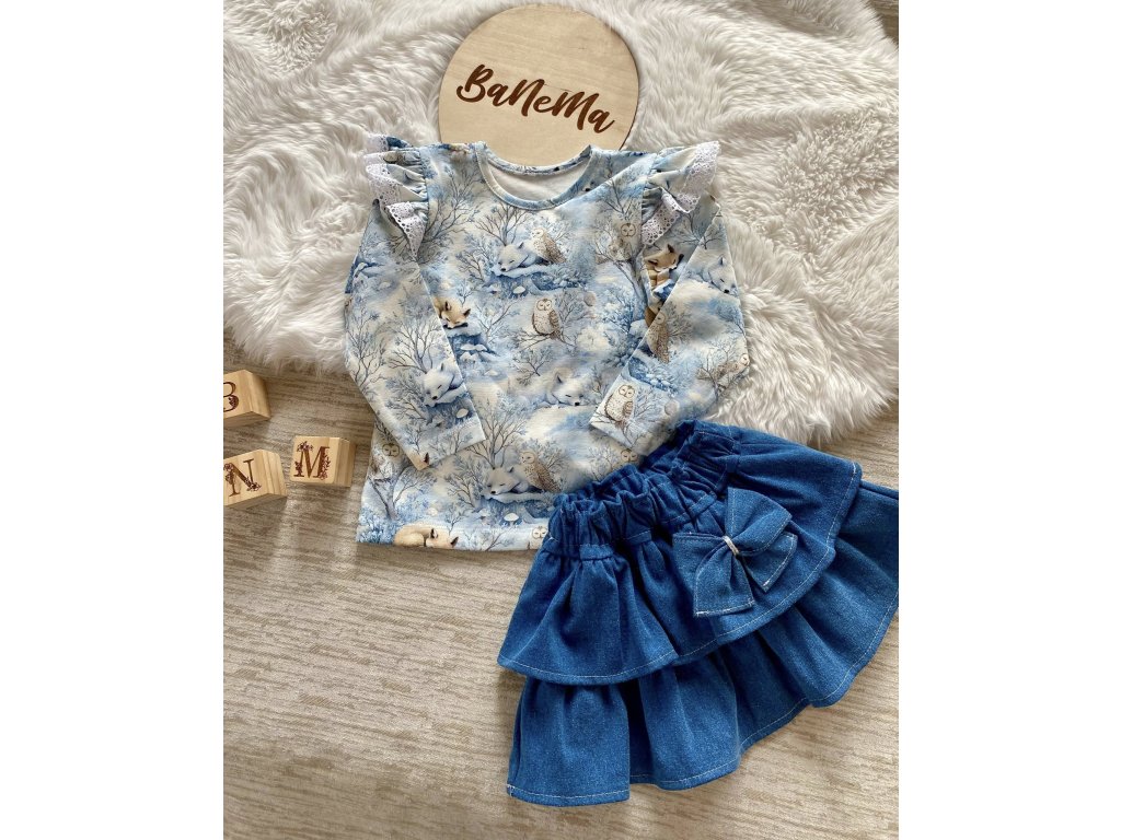 Tričko se pyšní okouzlující a detailně propracovaným zimním motivem, které dítě vtáhne do pohádkové sněhové krajiny. Tričko je v jemných odstínech modré, šedé, a bílé, který dokonale vystihuje atmosféru mrazivého, tichého lesa. Hlavními hrdiny této pohádky jsou roztomilá polární zvířátka. v závěji sněhu odpočívají lišky, sovy které odpočívají na větvích zasněžených stromů a mohou pozorovat klidnou scenérii. V pozadí vidíte jemné obrysy lesa a sněhové kopečky, doplněné drobnými houbami a pařezy stromů.