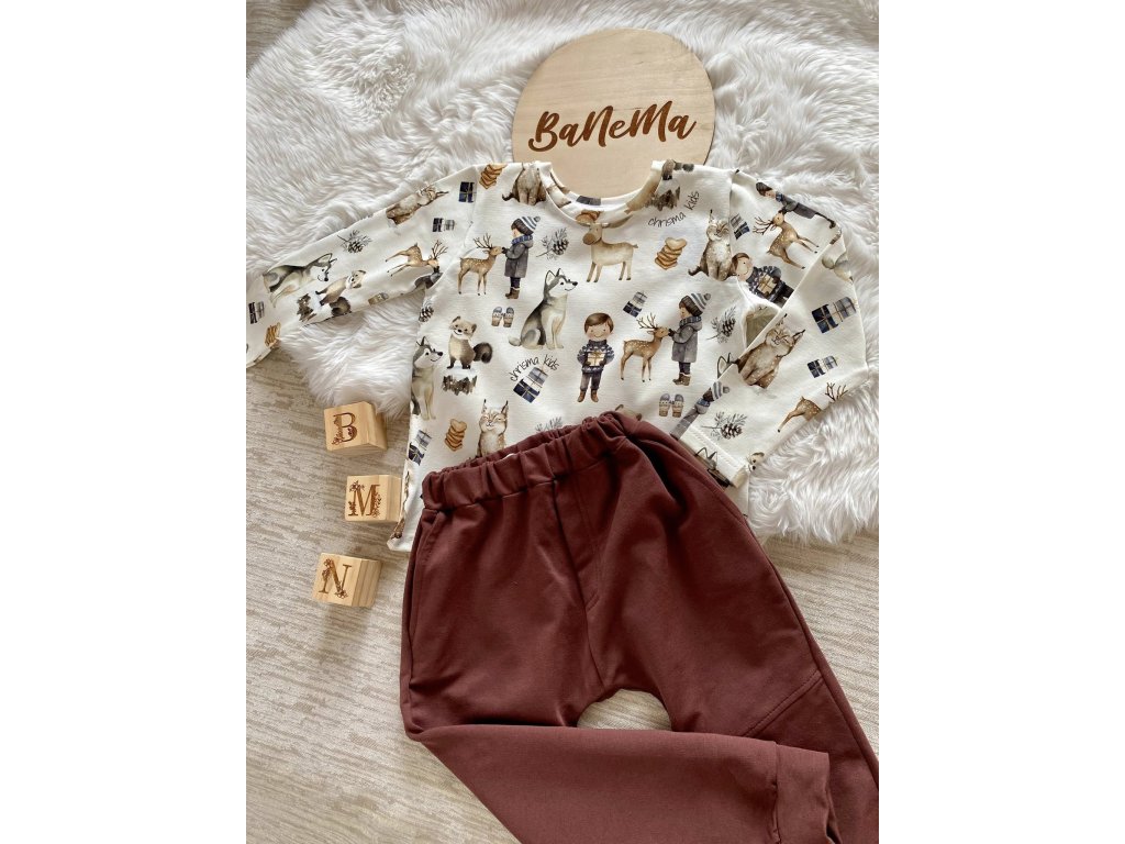 Vánoční tričko Chtisma kids s dlouhým rukávem, vzor zimní pohádka, husky, sob, jelen, rys na ecru podkladu. Vonící perníčky, šišky. Plno krásných kombinací inspiraci najdete v galerii.