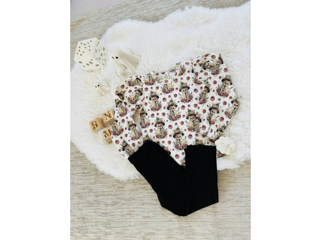 Jestli ještě nemáte outfit na Halloween, tak jsem tu pro Vás, jsem čarodějnická kočka co se ničeho nebojí, můžeme spolu kouzlit a být čarodějnický pár, těším se na tebe. Máme ve stejném vzoru gumičku a doladit hladkými černými legínami a je to parádní komplet.