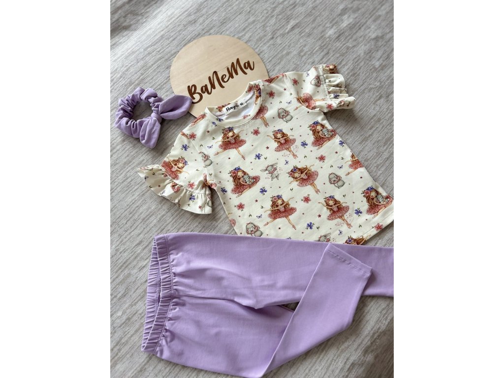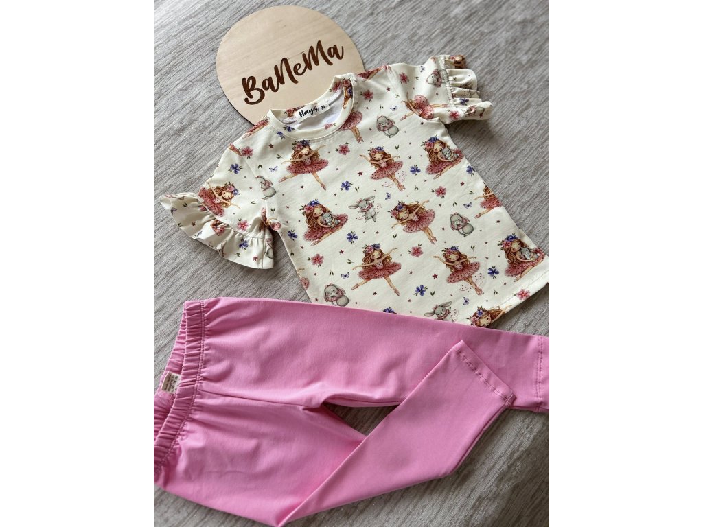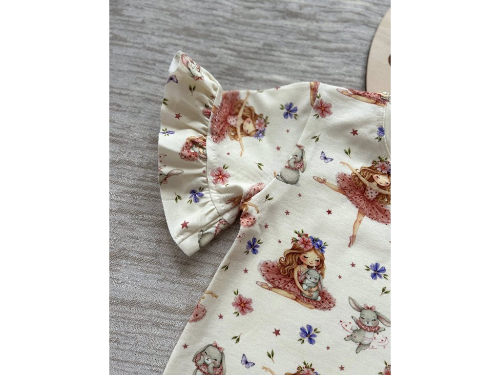 Ponořte se do světa fantazie s tímto nádherným tričkem, které rozzáří šatník každé malé princezny. Jemný vanilkový podklad zdobí okouzlující tančící baletky ve slušivých růžových sukýnkách a jejich zvířecí kamarádky zaječice co se rády roztančí jako baletky. Rukávek má decentní volánek. Nechte malé parádnice zazářit v tomto originálním kousku, který podporuje fantazii a radost z pohybu.