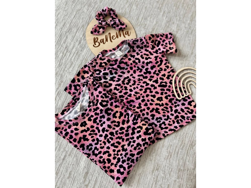 Oživte šatník své malé parádnice kouskem, který nepřehlédnete! Toto stylové dětské tričko s krátkým rukávem kombinuje hravost s moderním designem. Výrazný celoplošný leopardí vzor v tónech růžové a fialové s černými detaily dodá každému outfitu tu správnou dávku energie a stylu. Tento vzor nikdy neomrzí. Krásně ladí s růžovou, černou i broskvovou. Sluší k šortkám, legínám i džínům.