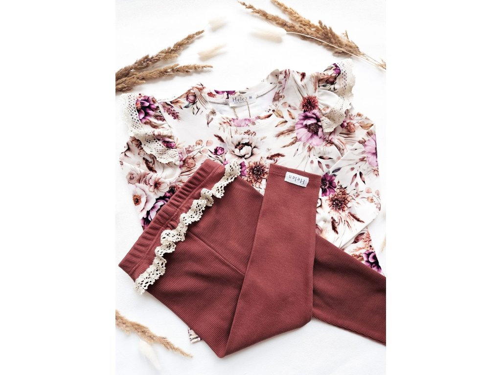 Toto tričko je elegantní a zároveň hravé. Má jemnou krémovou barvu, vzor jsou nádherné velké propracované květy pivoněk a růží které jsou dominantní a syté odstíny švestkové, oranžové, pudrové a růžové, zahaleny jsou do jemných prvků jako jsou suché trávy a klasy v jemných odstínech hnědé a béžové. Mnoho nádherných kombinací, buď to se stejným vzorem legín, nebo dalších hravých odstínech skořicové, čokoláda, amarantové a světle růžové.
