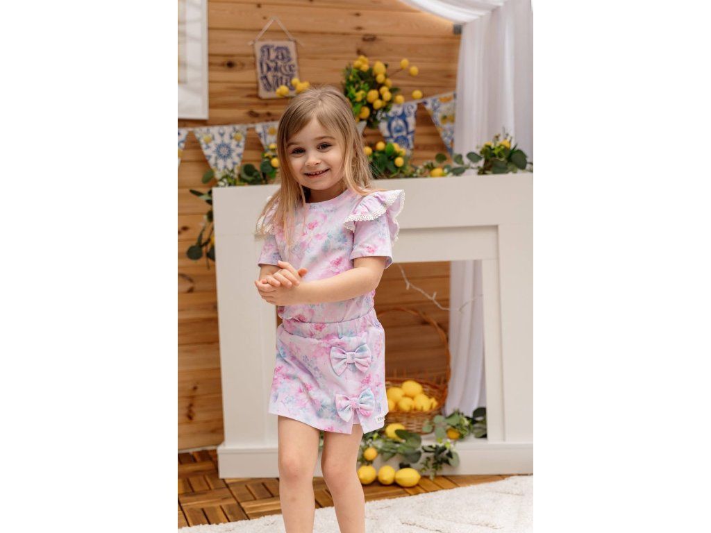 Okouzlující dívčí tričko s jemným, akvarelovým potiskem květin v pastelových barvách (růžová, fialová,modrá). Tričko má krátké rukávy zdobené elegantními volánky s bílou krajkou, což dodává hravý a dívčí vzhled. Hodí pro každodenní nošení, do školky, hru i volná čas. Snadno kombinovatelné s džíny, sukňošortkami, nebo legínami pro vytvoření roztomilého nebo šmrncovního stylového outfitu.