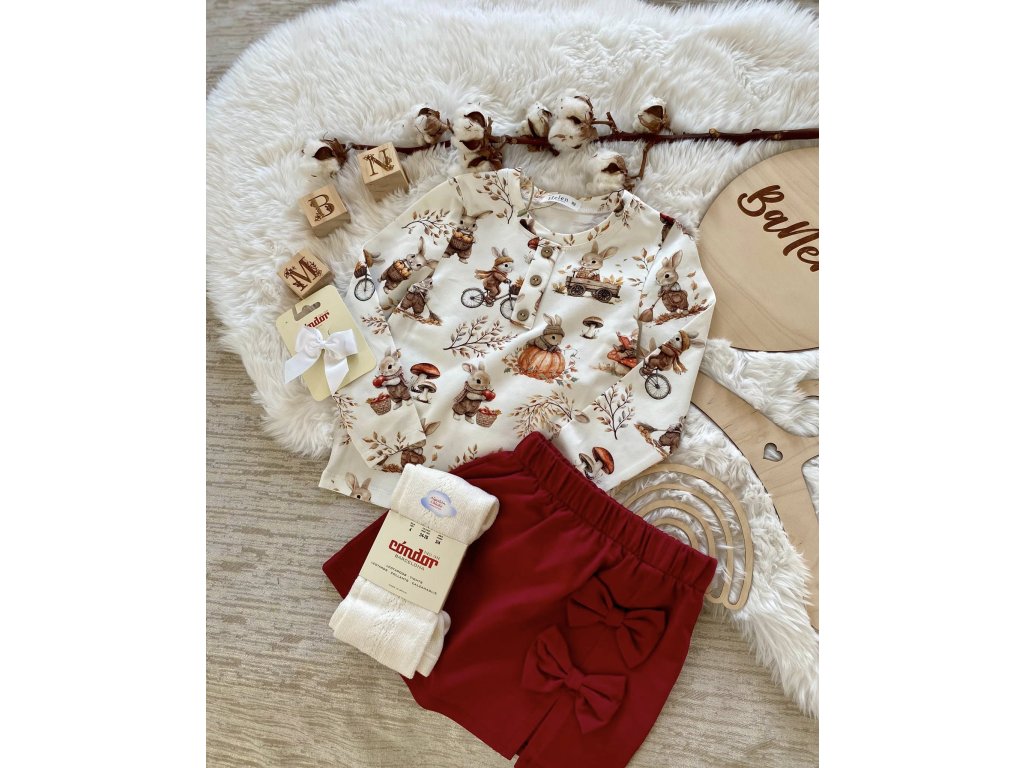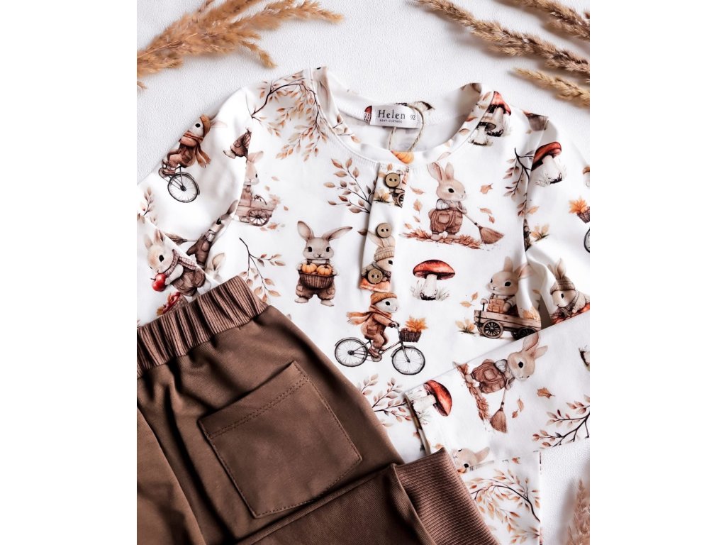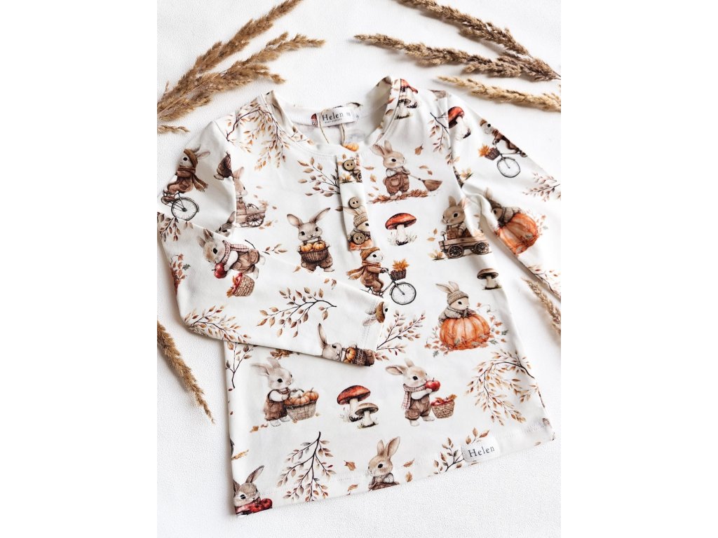 Dlouho očekávaná novinka trička králíci, jsou konečně tu. Vzor tvoří králíci v podzimním prostředí, kteří jsou oblečení do kalhot s laclem, čepic a šál. Někteří králíci jedou na kole, jiní sbírájí jablka do košíku, zametají listí, nebo sedí vedle dýní. Dokonalí kousek jak pro kluky tak holky. Nic krásnějšího jsme dlouho neviděli.