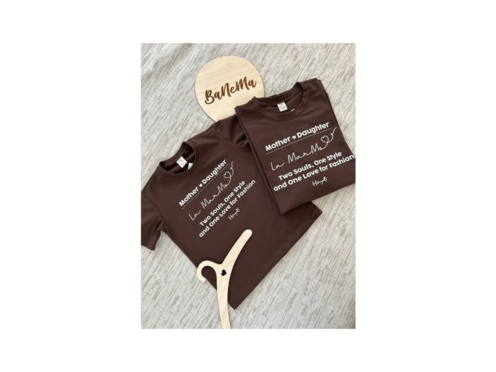 Jestli vaše holčičky mají rády stejná trička jako máte vy, tak jim můžete udělat radost s tímto tričkem v čokoládové barvě, s nápisem, dvě duše, jeden styl a jedna láska k módě. Máme stejné pro maminku.