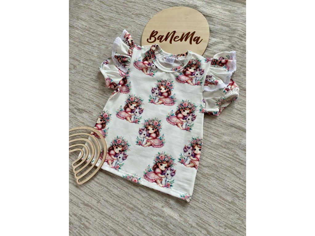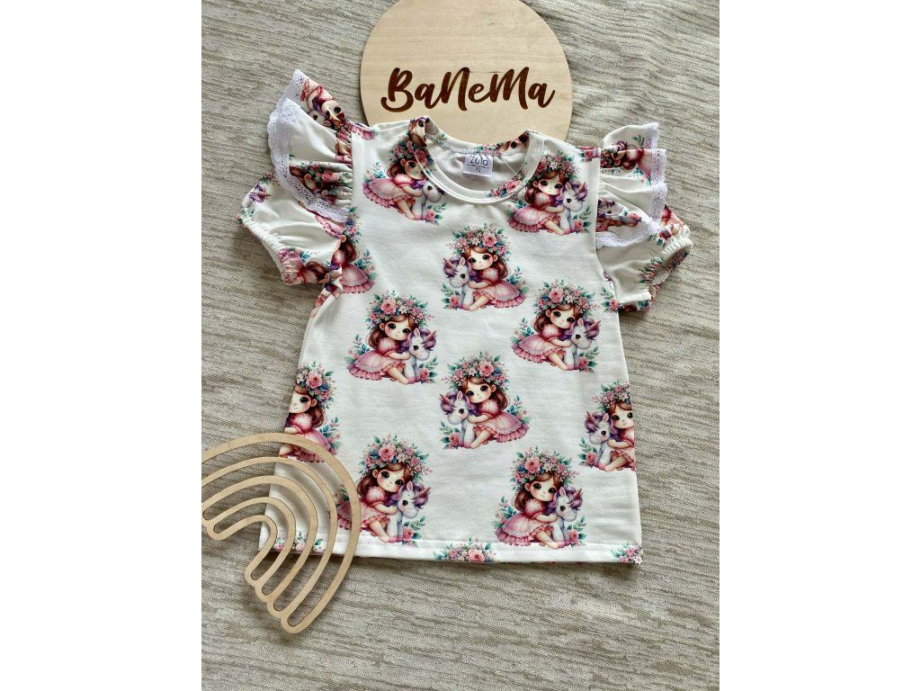 Překrásné tričko s volánky a krajkou na ramenou. Seznamte se s roztomilými dívenkami a jejich kouzelnými kamarády. Vaše malá bude tohle tričko milovat.