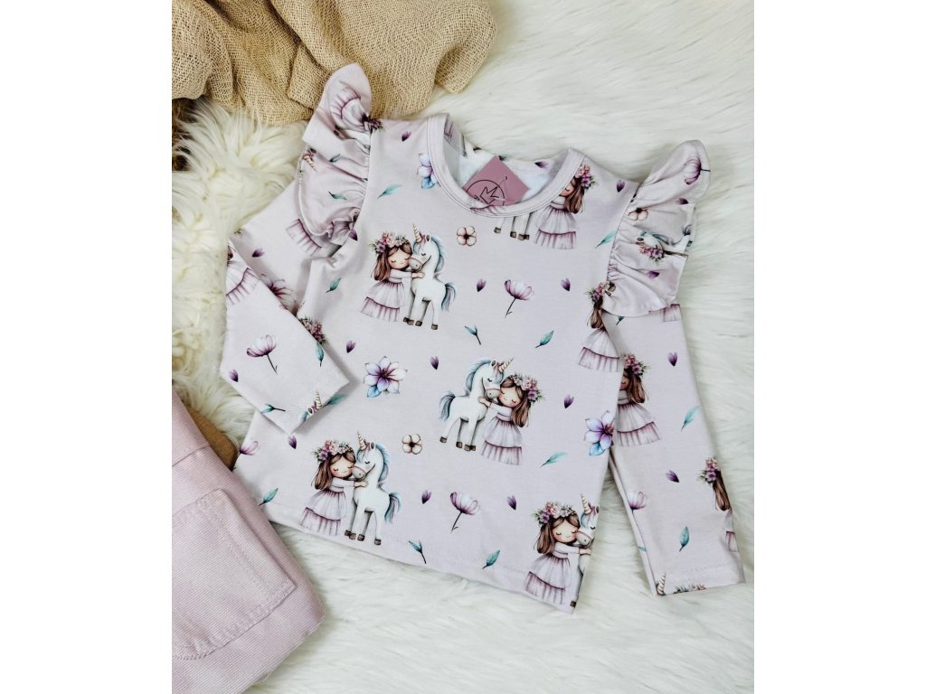 Nádherné tričko s dlouhým rukávem a jemným volánkem na rukávu, který dodává hravý vzhled. Potisk je krásná panenka objímající svého milovaného jednorožce na louce mezi květinami a ve větru poletujících okvětních lístků.