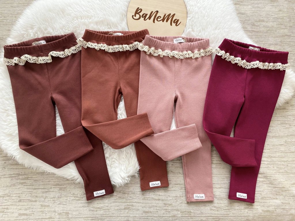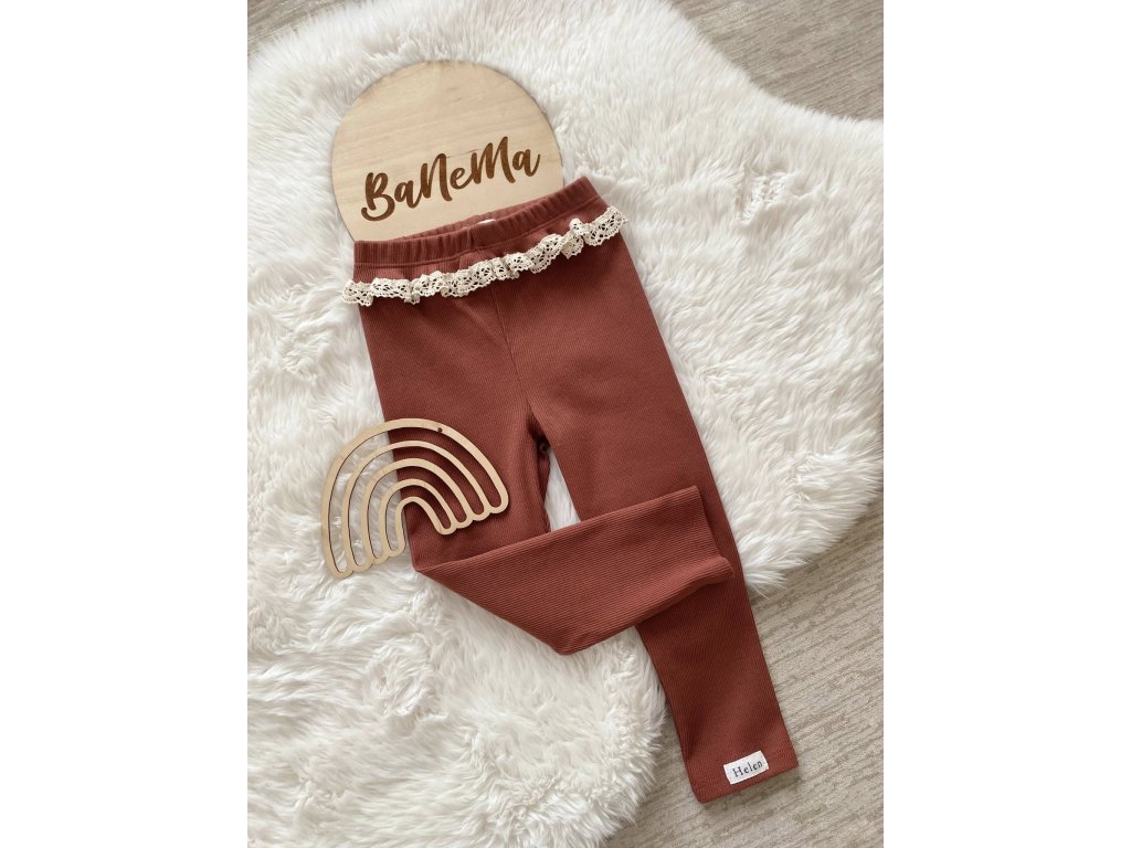 Krásné kvalitní žebrované legíny z vysoké gramáže bavlny s krajkou. Barva skořicová, ozdobná krajka kolem pasu je krémová.