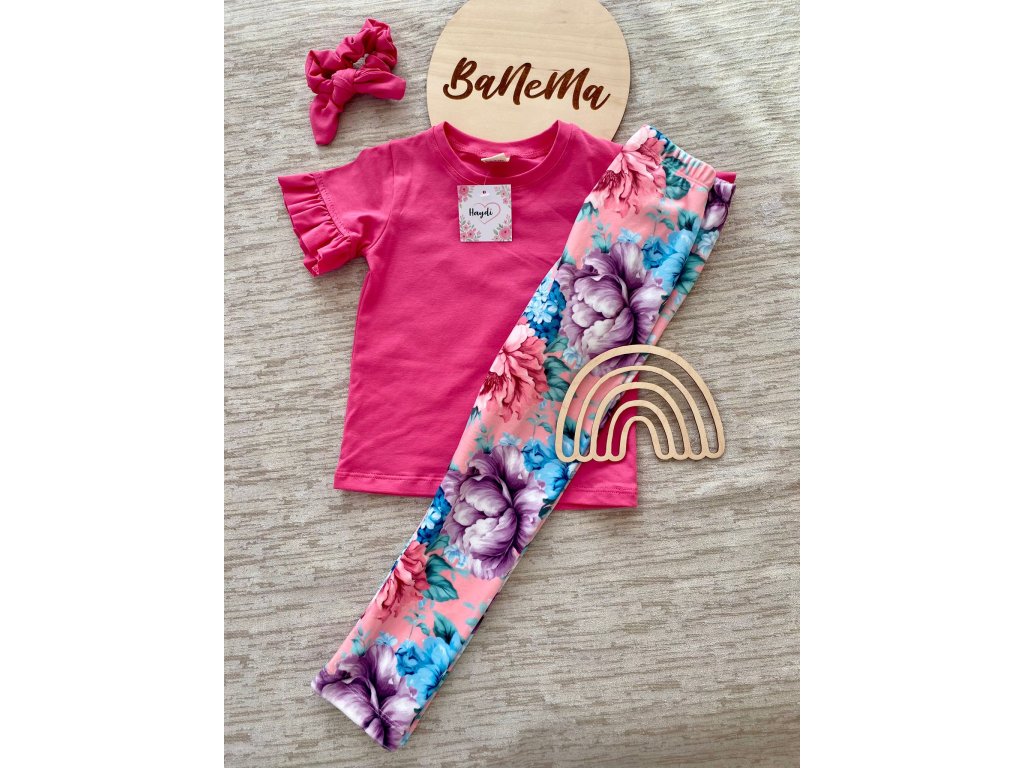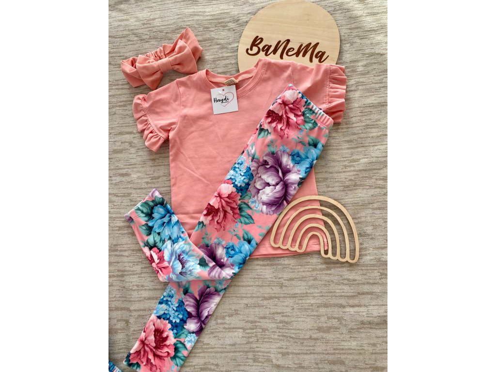 Nádherné velurové legíny Haydi s motivem rozkvetlých květin na broskvovém podkladu, kombinujte se stejně vzorovanou mikinou jako souprava, nebo s jedobarevnými svršky malinové, růžové, tyrkysové nebo modré barvy.